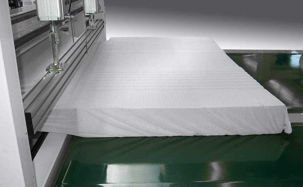 Quernähstation zum zum Ablängen bei gleichzeitigem Säumen von Matratzenplatten oder Steppdecken