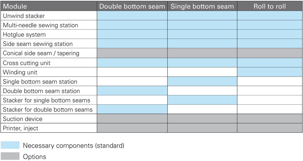 Depending on the processing (double bottom seam, single bottom seam, processing “roll to roll”) the following equipment variants are possible: